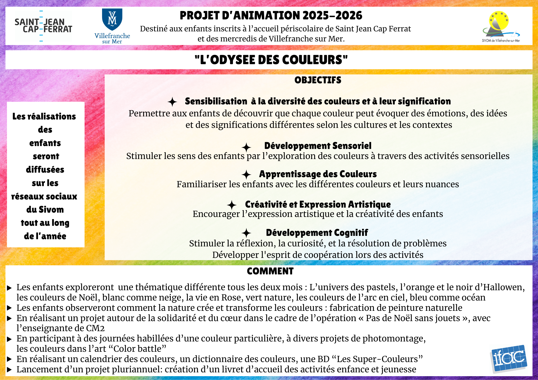 Les accueils de loisirs du Sivom de Villefranche-sur-Mer sont un lieu d’accueil, d’éveil, de découverte et de socialisation pour les enfants. Ils favorisent l’apprentissage de l’autonomie en les laissant choisir leurs activités, en respectant et favorisant leur parole.
